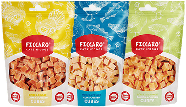 Aktive hundeeiere stiller store krav til belønningsbiter. Både størrelse og kvalitet er viktig. Ficcaro har i samarbeid med hundetrenere utviklet serien CUBES. Denne serien kommer i flere varianter, med flere protein kilder for variasjon.